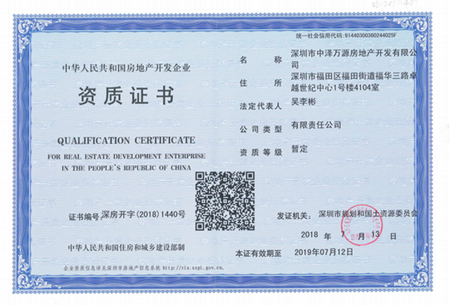 2018年7月20日,深圳市中澤萬源房地產(chǎn)開發(fā)有限公司(以下簡稱“中澤萬源”)成功獲得《中華人民共和國房地產(chǎn)開發(fā)企業(yè)資質(zhì)證書》,這為公司進(jìn)一步做大做強房地產(chǎn)投資業(yè)務(wù)打下堅實的基礎(chǔ),也為貝悅匯項目下一步順利獲得預(yù)售證提前做好準(zhǔn)備。