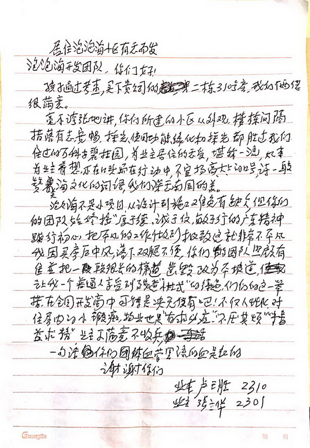 2017年11月9日,泡泡海家園2棟2310業(yè)主專程為服務中心送來了表揚信,感謝物業(yè)工作人員細致入微、盡心盡責的服務,表達自己對物業(yè)和開發(fā)商的感激之情。
