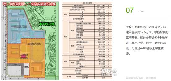 學(xué)校占地面積達(dá)11萬(wàn)㎡以上,總建筑面積約12.5萬(wàn)㎡,學(xué)校擬共分三期開(kāi)發(fā)。預(yù)計(jì)會(huì)開(kāi)設(shè)108個(gè)教學(xué)班,其中小學(xué)、初中、高中各36班,可滿(mǎn)足4200名以上學(xué)生就讀。