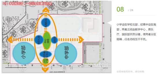 小學(xué)設(shè)在學(xué)校北部,初高中設(shè)在南部,兩者之間由教學(xué)中心,音樂(lè)廳、國(guó)際部天然分隔,使兩者分區(qū)明確,行走動(dòng)線(xiàn)互不干擾。