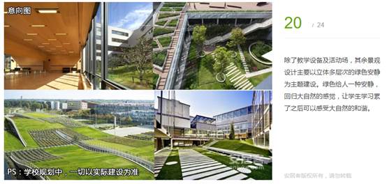 除了教學(xué)設(shè)備及活動(dòng)場(chǎng),其余景觀(guān)設(shè)計(jì)主要以立體多層次的綠色安靜為主題建設(shè)。綠色給人一種安靜,回歸大自然的感覺(jué),讓學(xué)生學(xué)習(xí)累了之后可以感受大自然的和諧。