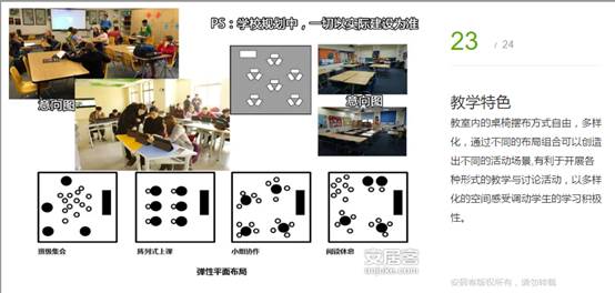 教室內(nèi)的桌椅擺布方式自由,多樣化,通過(guò)不同的布局組合可以創(chuàng)造出不同的活動(dòng)場(chǎng)景,有利于開(kāi)展各種形式的教學(xué)與討論活動(dòng),以多樣化的空間感受調(diào)動(dòng)學(xué)生的學(xué)習(xí)積極性。