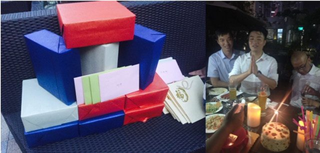 在生日會的最后,伴隨著歡快的生日快樂歌大家點燃蠟燭并一起許下生日愿望,一個個蛋糕象征一個團(tuán)結(jié)的集體,一支支閃亮的蠟燭象征著一顆顆跳動的心,心因集體而精彩,集體因心而自豪。光影下的那一張張笑臉,感染的整個空氣都是歡快的,連夜晚都浸滿了蛋糕細(xì)弱游絲的清香。
